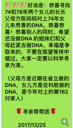 2017年姐妹相认【养女方】不计。寻亲163家团圆,寻亲帮帮团dna数据库建立,起决定作用。唯一针对莆田养女。和寻亲父母。入库现实不受限制大数据库。自动比对。大家转告大家。爱传递。骨肉分离家。合家团圆。谢谢