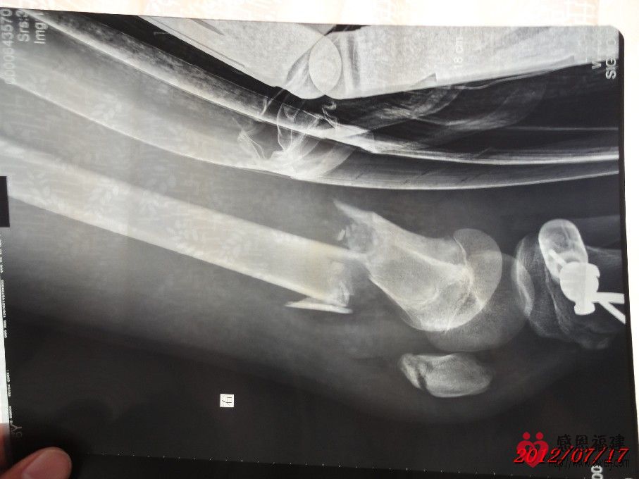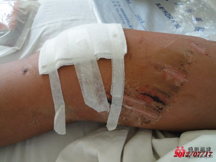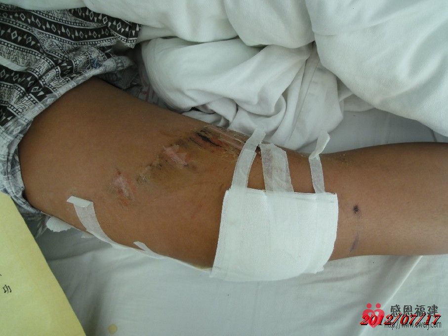 2、住院情况:事故发生后家人将智在送往闽清县医院治疗,医院同意住院并可安排第二天手术;但智在是一家四口中唯一没有残疾的(由于残疾的父亲在医院照顾智在,哑巴的母亲精神不好还时常跑回老家又不会照顾人,导致眼睛残疾的小弟弟几天没吃上两顿饭),家人和亲戚为了智在治疗后不留下后遗症,最后决定送往福州市第二医院治疗,并于当晚存了2,000元住院费并办好住院手续。但由于家境贫寒,智在的父亲和亲戚到处借债(有的500,有的1,000……),好不容易东拼西凑才筹集到手术费用(现在已经累计存入医院38,000元),手术于7月11日进行,效果还比较理想,但出院时间待定。